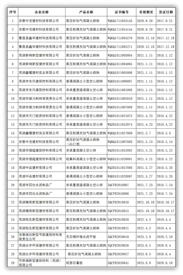 四、芜湖市企业取得安徽省新型墙体材料产品证书企业名单